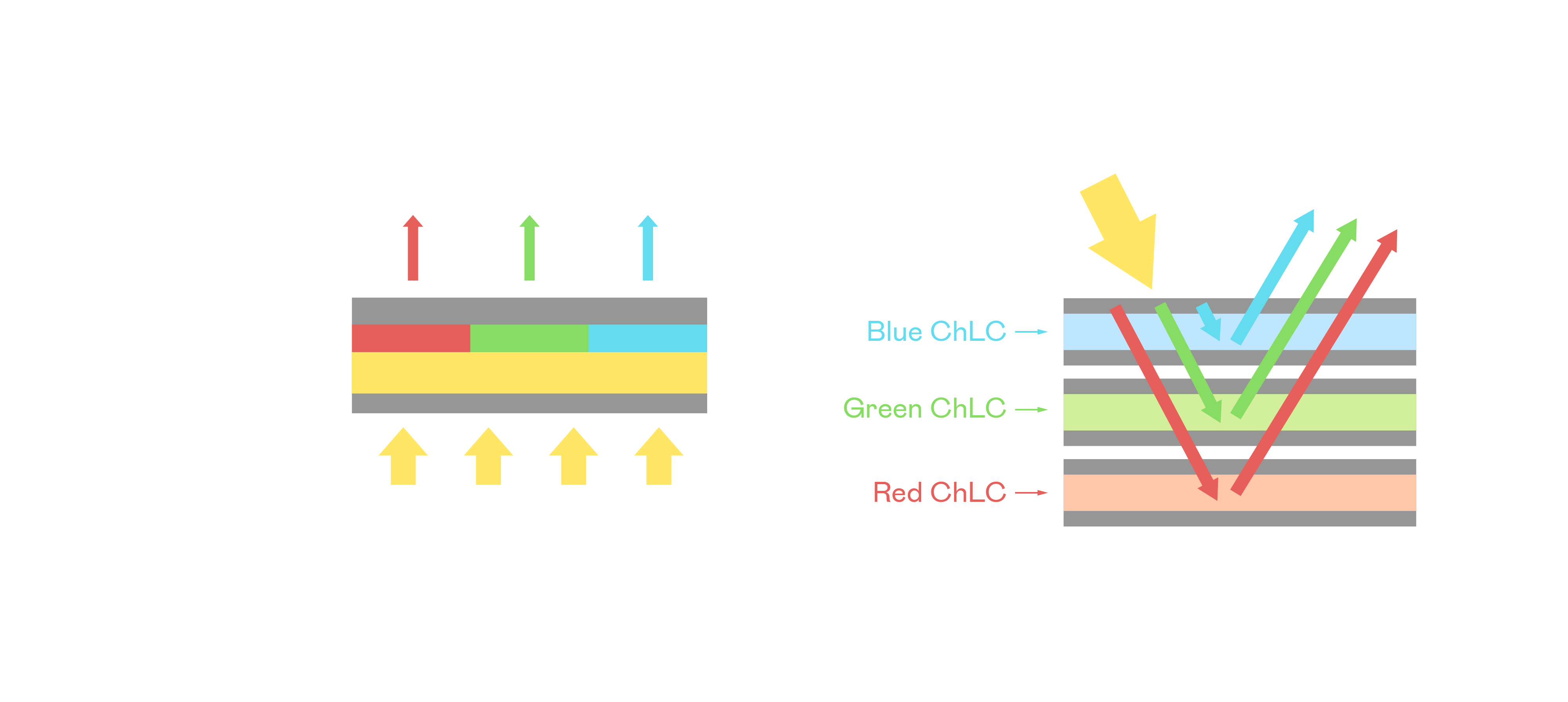 AG亚游集团胆固醇液晶显示器是由红、绿、蓝三层胆固醇液晶面板堆叠而成,并采用无彩色滤光片设计,减少环境光在反射过程中的损耗。